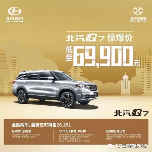 當(dāng)然如果你覺得首付50%有壓力的話,小編再傳授你一招“花式買車法”。你可以選擇北汽Q7的“標(biāo)準(zhǔn)貸 全貼息”金融貸款政策,你只需要首付20%,剩下的車款分36期還清即可,并且也是沒有利息的噢,輕輕松松省下11957元利息,并且還讓銀行承擔(dān)了你的貶值損失。