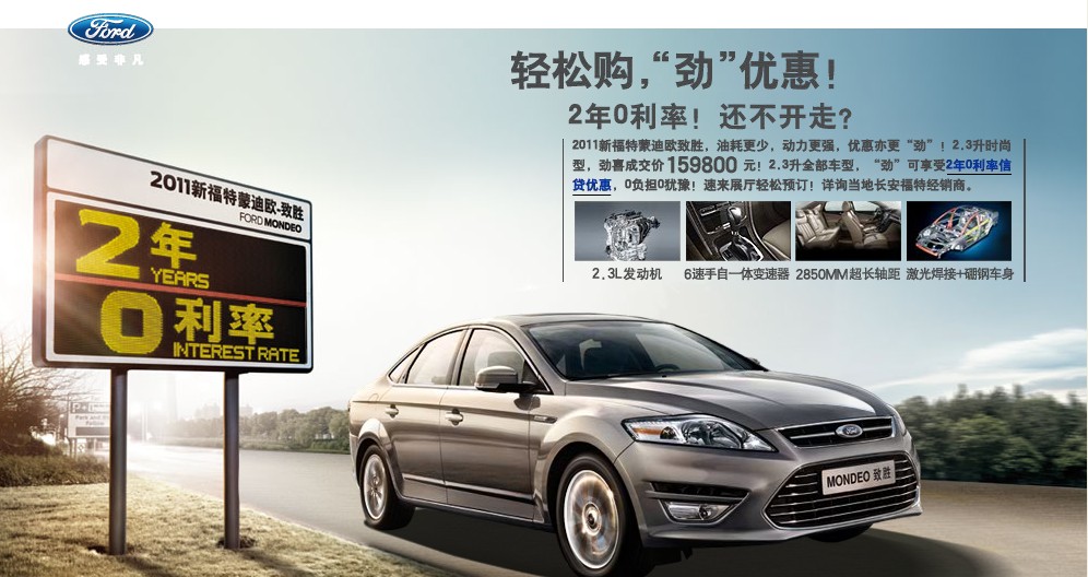 2011新福特蒙迪歐-致勝,油耗更少,動力更強,優(yōu)惠更“勁”!2.3升時尚型,驚喜獎僅15.98萬元!2.3升全部車型,“勁”可享受2年0利率信貸優(yōu)惠,0負擔0猶豫!速來展廳輕松預訂!