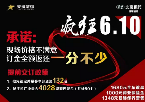 天嬌集團特批75萬現(xiàn)金,北京現(xiàn)代提供132臺廠方本部資源                             —— 廠方承諾:‘只要銷量,不談價格’現(xiàn)場價格不滿意