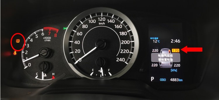 如果啟動(dòng)車輛時(shí)發(fā)現(xiàn)胎壓燈點(diǎn)亮,首先查看儀表顯示的胎壓數(shù)值,略低于180kPa時(shí),可低速行駛至就近的一汽豐田經(jīng)銷店檢查確認(rèn)。