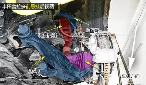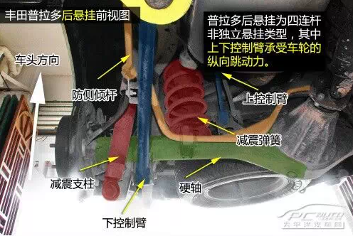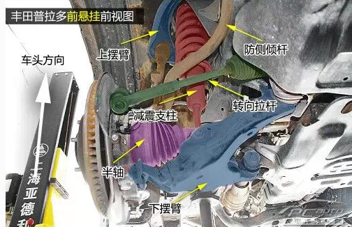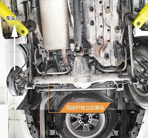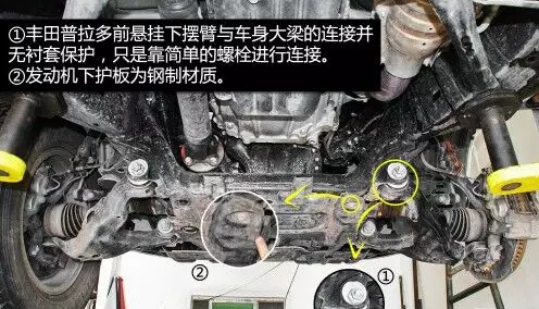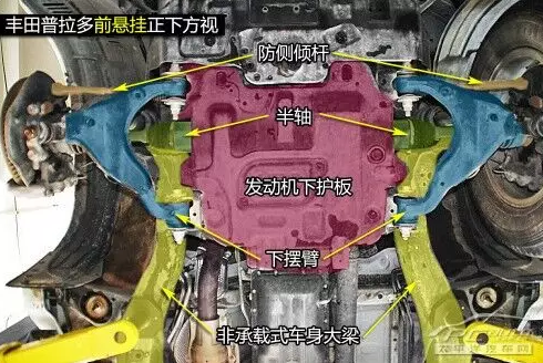 普拉多前雙叉臂式獨(dú)立懸掛在空間利用率方面雖稍遜于麥弗遜懸掛,但兩者結(jié)構(gòu)都是相當(dāng)緊湊的,且由于多了上擺臂,在抓地性和防側(cè)傾等方面的表現(xiàn)都要比后者優(yōu)秀。普拉多發(fā)動機(jī)下方有護(hù)板保護(hù),且為鋼制。在下擺臂和車身大梁的連接方面則是使用較為簡單的螺栓連接。