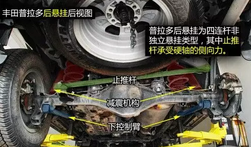 普拉多后四連桿結(jié)構(gòu)帶止推桿,止推桿一頭連接在車身上,一頭連接到硬軸上,承受硬軸的側(cè)向力作用,上下控制臂則承受車輪的上下跳動力。后懸掛減震彈簧頂部內(nèi)嵌有橡膠,在彈簧壓縮至極致時起到緩沖保護(hù)作用。