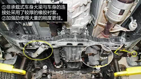 車身大梁中部有加強(qiáng)肋,大大提高了剛度,大梁與車身的連接處使用了較厚的橡膠襯套,慮振效果較好。油箱有金屬蓋板保護(hù),上面有導(dǎo)流槽以及通風(fēng)孔,有利于氣流快速通過并且?guī)ё邿崃俊!≈醒氩钏倨鲙Р钏冁i,為托森限滑差速器類型?!『鬄殚_放式差速器,不帶差速。前后減震支柱均為日本制造。
