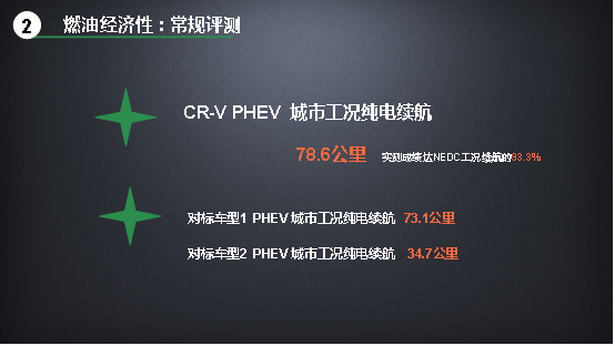 CR-V 銳·混動(dòng)e+城市工況和高速工況純電續(xù)航里程均長(zhǎng)于兩個(gè)對(duì)標(biāo)車型。