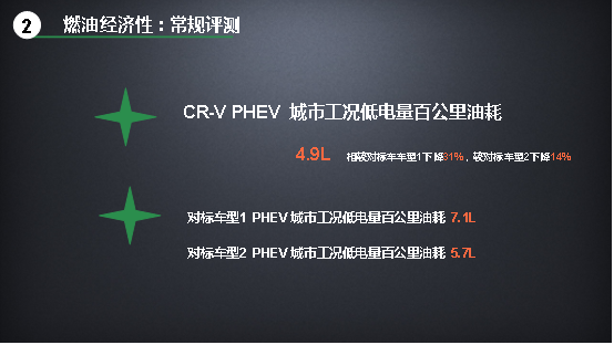 然后我們對(duì)比一下CR-V銳·混動(dòng)e+與對(duì)標(biāo)車型的油耗差別。城市油耗和高速油耗,CR-V銳·混動(dòng)e+是4.9L和5.4L,對(duì)標(biāo)車型1則是7.1L/8.0L,對(duì)標(biāo)車型2是5.7L/6.1L。