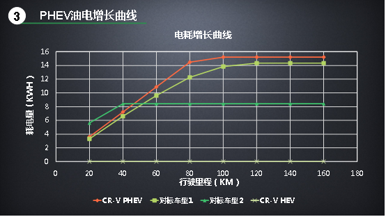 需要提示的是,這個(gè)曲線是在車輛滿電、均速22.3km/h的工況下測(cè)試獲得的,并且圖表只展示到300公里的趨勢(shì)預(yù)測(cè),因此出現(xiàn)了三款PHEV車型的油耗均低于CR-V銳·混動(dòng)的情況。伴隨著里程的進(jìn)一步延長(zhǎng),或者直接以低電量工況測(cè)試,對(duì)標(biāo)車型1和對(duì)標(biāo)車型2的油耗數(shù)據(jù)會(huì)持續(xù)增長(zhǎng)并超過CR-V銳·混動(dòng)的油耗(其中對(duì)標(biāo)車型1會(huì)達(dá)到7.1L左右,對(duì)標(biāo)車型二會(huì)達(dá)到5.7L左右),而CV-R銳·混動(dòng)e+的峰值則只會(huì)與CR-V銳·混動(dòng)接近(4.9L左右)。