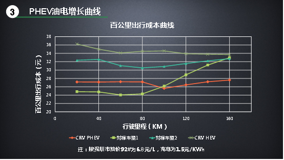 最后一個(gè),也是更直觀的,即百公里出行成本曲線——它直接對(duì)應(yīng)到你花的“錢”。圖表看上去復(fù)雜,其實(shí)也很直觀:橫軸對(duì)應(yīng)多少公里,縱軸找到出行成本的金額即可。那么很清晰,100公里及以上,CR-V銳·混動(dòng)e+的成本是最低的。