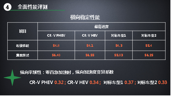 關(guān)于這一點(diǎn)我們的解讀是,相對(duì)于打雞血式的急加速,Honda對(duì)于CR-V銳·混動(dòng)e+的穩(wěn)定性和舒適性更為看中。這其中,剎車距離、麋鹿測(cè)試成績(jī)都是與主動(dòng)安全性密切相關(guān)的,它體現(xiàn)出車輛避免事故發(fā)生的能力。而縱向平順性和降噪性能等,則均與駕乘舒適性有關(guān)。