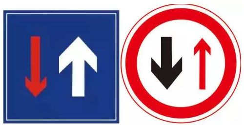會車先行:表示車輛會車時(shí),有條件避讓的車要讓無條件避讓的車先行通過。此時(shí),紅色箭頭行駛方向的車輛要停車讓行,白色行駛箭頭方向車輛要先行。